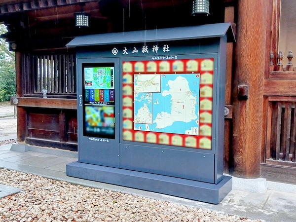 大山祇神社に設置された「神社ナビタ」のサイズは、全高2,290mm・横幅2,580mm・奥行700mmで、右側にはLEDによる電照式の古地図風周辺案内図を配し、左側にはタッチ式デジタルサイネージを設置している。