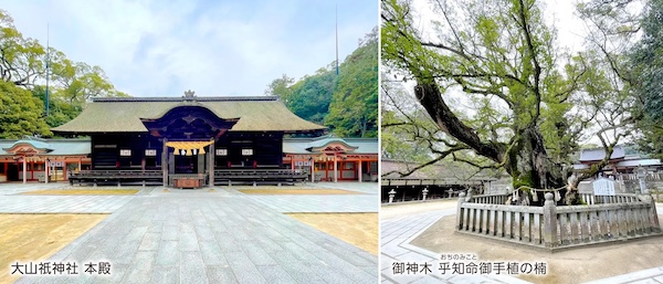 本殿正面にそびえる御神木の樹齢は2600年あまりとされ、「小千命-おちのみこと(乎知命)御手植の楠」と呼ばれる。神武天皇御東征前に、大山積大神の子孫「小千命」によって植えられたと伝わる。また、ご神木本の周りを「息を止めて3周すれば願いがかなう」と言い伝えられ、パワースポットとして多くの参拝者が訪れているそうだ。