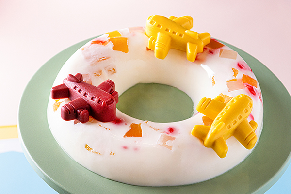 「まもなく着陸」は、チェリーやパイナップルなどのキャンディフルーツをミルクババロアで包んだ一品。飛行機を象ったチョコレートが添えられている。