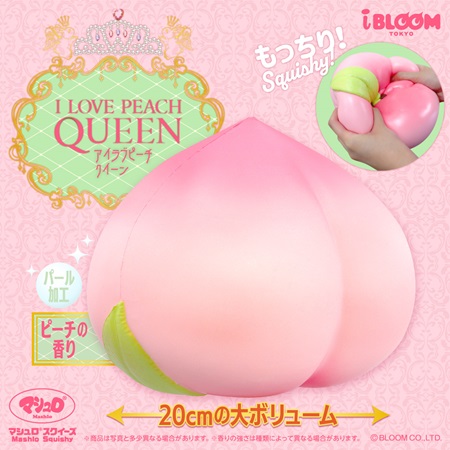 「アイラブピーチ クイーン」6,600円(税込)は、iBLOOMを代表する大定番スクイーズ。幅20cmを超える特大サイズに加え、上品なパール仕様が特徴だ。見た目のインパクトはもちろん、ふわふわの触り心地も楽しめる。