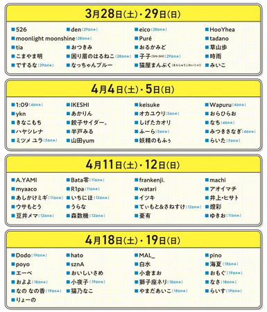 また、4月5日(日)・12日(日)を除き、イベント開催日の14:00~17:00には、出展クリエイターによるライブペイントを実施。なお、クリエイターの制作状況により時間が変動する場合がある。