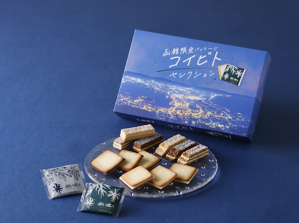 「コイビトセレクション 函館限定パッケージ」2,160円(税込)は、4月23日(木)から函館市内の一部土産店でも販売予定。「白い恋人(ホワイト・ブラック)」各6枚とミルフィーユ菓子「美冬 こがれ雪(いちご・オレンジ・アップル)」各2個を詰め合わせ、函館山からの夜景をデザインしたパッケージが特徴となっている。