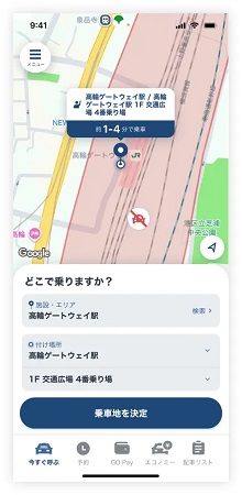 今回、新たに高輪ゲートウェイ駅にて、「GO」アプリ注文が可能となる実証実験を開始。高輪ゲートウェイ駅でのアプリ注文時は、駅直結のTAKANAWA GATEWAY CITY交通広場1階の4番のりばが乗車地として自動設定される。