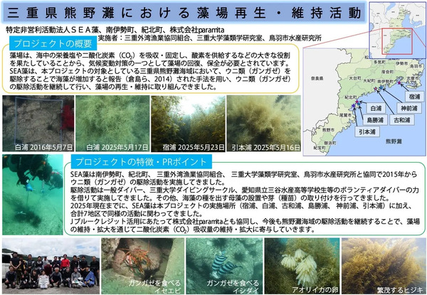 SEA藻は、熊野灘の海の再生を目指して、2015年からガンガゼ駆除を中心とした藻場再生活動を実施。漁業者や自治体、研究機関と連携し、失われた藻場を人の手で取り戻す取り組みだ。