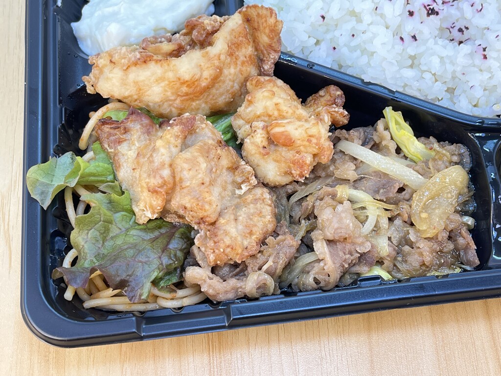 メインおかずは唐揚げと焼肉の盛り合わせ♪