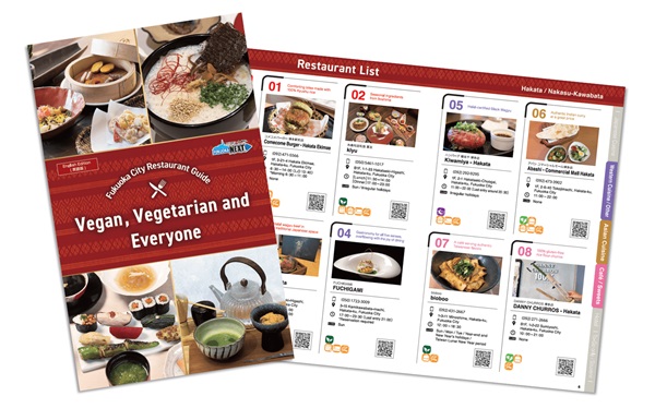 今回は、飲食店の情報をまとめたガイドブックを、日本語版・英語版の2言語で用意。ヴィーガン・ベジタリアンなどの各飲食店の対応内容や、英語メニューの有無などを、アイコンでわかりやすく表示。また、福岡市の観光情報や旅行に役立つ情報も掲載されている。