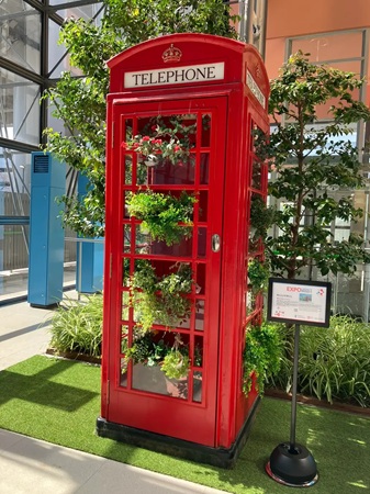 この赤い電話ボックスは、英国の街中で実際に使用されていたもので、万博会場ではアイビーなどの植物で装飾され、英国らしい美しいフォトスポットとして人気を集めた。