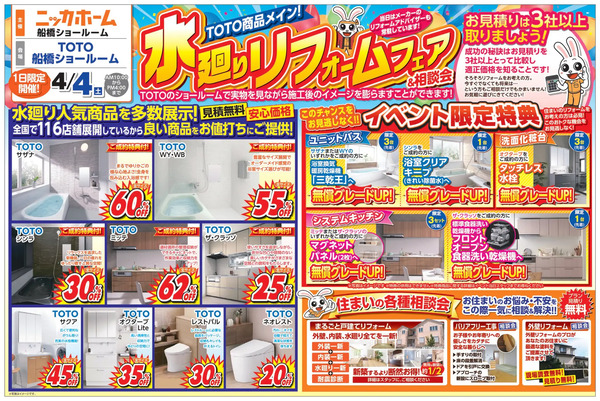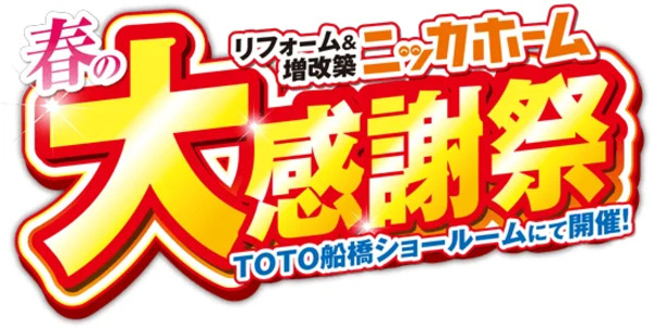 全住宅リフォーム事業を手がけるニッカホーム関東支社・船橋ショールームが、4月4日(土)10:00より、TOTO船橋ショールームにて「春の大感謝祭」を開催!予約不要で誰でも参加できる。