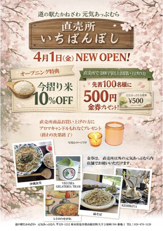 オープニング特典として、「今摺り米」が10%OFFになるほか、直売所で2,000円以上購入した先着100名に「500円金券」をプレゼント。金券は、直売所以外の元気あっぷむら内の店舗「沖縄食堂」「VECCHIA GELATERIA TRAM」「レトロのせがれ」「縁そば」「KESHIKIYA」で使用できる。