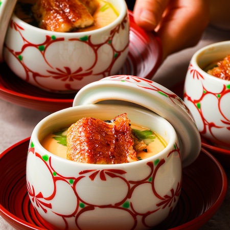 「うなぎ入り茶碗蒸し」は大分県産ブランド卵「蘭王」を使用。ミネラル分豊富な天然飼料で育った鶏から生まれた卵に、店内で丁寧に鰹節や昆布からとった出汁を調味して合わせ、贅沢にうなぎの蒲焼をのせている。