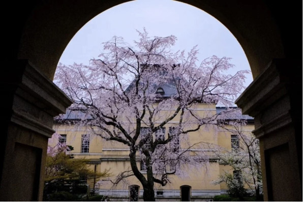 京都府庁旧本館の祇園しだれ桜 見頃 2023年3月24日(撮影:MKタクシー)
