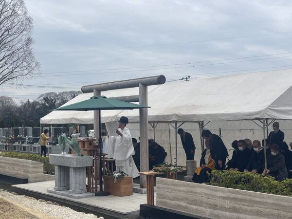 僧侶による読経に続き、祭儀の中盤、静寂に包まれた境内において、現在納骨されている方のうち式年祭(※)にあたる十五柱の方々の御名前が、神職によって一人ずつ丁寧に「氏名奏上(しめいそうじょう)」された。