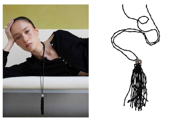 「PRISM TASSEL N」25,550円(税込)は、イタリア製ビーズを使用して繊細に仕上げた一品で、ロングネックレスとしても、二重巻きにして短く演出することもできる。