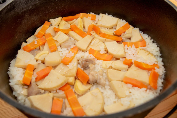 「たけのこ炊き込みおこげごはん」は、群馬県産コシヒカリと白沢の天然水に、旬の竹の子と、鶏肉、人参を使用。備長炭&円形鉄板とダッチオーブンで炊き上げることにより、香ばしいおこげも楽しめるアウトドア感満載の一品だ。