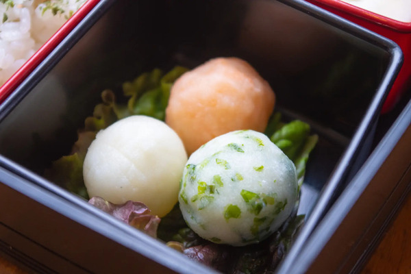 「特製愛犬ディナー 2026春ver」のメニューは、じゃがいもをメインに使用し、人参、青のり、プレーンと春らしくカラフルな三色団子に仕上げた「お花見じゃがいも団子」、