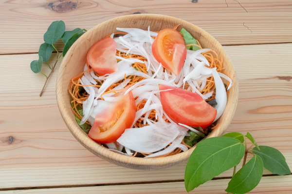 「春の新玉ねぎサラダ」は、辛味が少なく甘みが非常に強い、新玉ねぎが主役のフレッシュサラダ。オリジナルドレッシングで味わう。