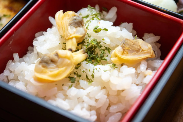 あさりの出汁で炊いたご飯に、あさりのむき実もトッピングした食感も匂いも楽しめる「あさり出汁ご飯」、