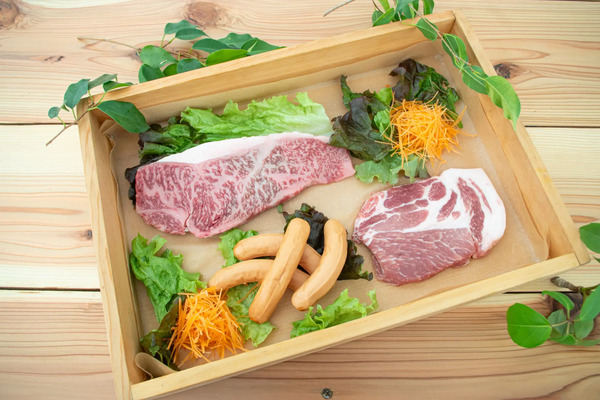 「赤城牛と福豚のお重」は、赤城牛の味を存分に味わえる贅沢な厚切りカット。備長炭鉄板で好みに焼いて、仕上げにフランベで香り付けすれば、焼いても食べても満足できる一品だ。群馬県産豚の肩ロースと福豚ポークソーセージも用意しており、群馬の味覚が詰まったお重となっている。