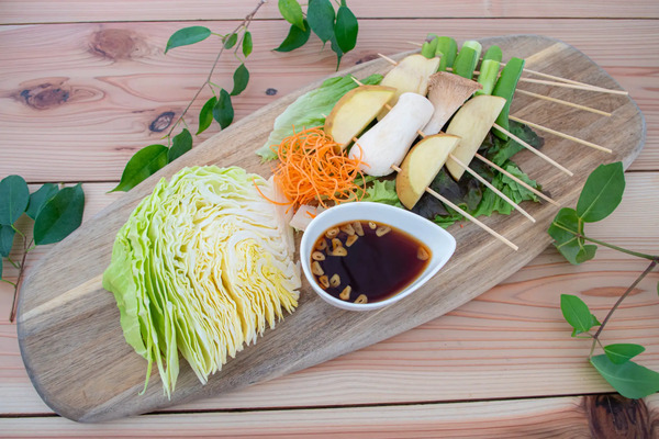 「春キャベツステーキと季節野菜の串焼き」は、柔らかい食感と甘みが強い新鮮な春キャベツに火を通すことで、香ばしさがアップ。鉄板焼きで豪快に焼き上げた春キャベツは、ポン酢にんにくタレを絡めてサッパリとした味わいを楽しめる。