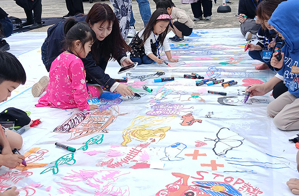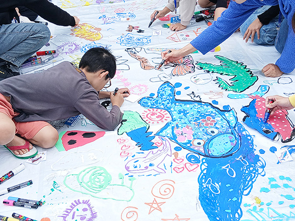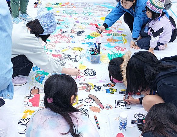 同イベントは、南都グループが大切にしてきた沖縄の魅力を、次の世代へとつないでいくことをテーマに企画された。当日は沖縄県内の小学校3~4年生を中心に、子どもたち63名とその保護者が参加。会場となった「おきなわワールド」内の「琉球王国城下町」エリアの赤瓦古民家前にて、巨大な透明ビニールシート(1.2m×3.5m)4枚をキャンバスに見立て、海・空・山の生き物や花など、思い思いのモチーフを自由に描いた。