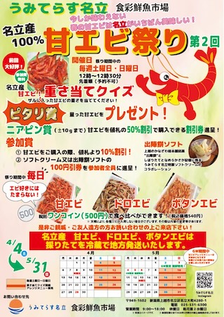 互恵グループのゆめ企画名立が運営する「道の駅 うみてらす名立」は、名立漁港で水揚げされた新鮮な甘エビを楽しめる「名立産100%甘エビ祭り 第2回」を、4月4日(土)〜5月31日(日)の期間中、毎週土日に開催する。