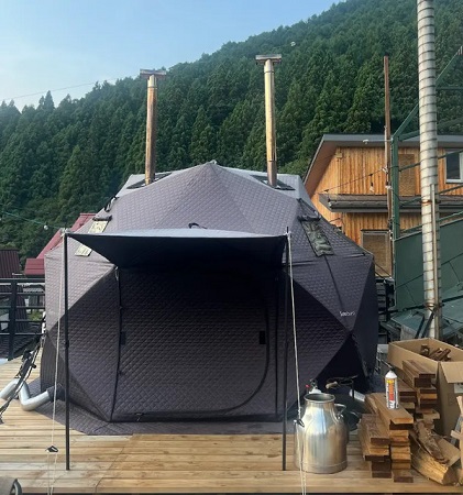 バーベキューと同じく4月〜11月の期間、宿泊者限定でテラスでの極上テントサウナを体感することが可能。4月の雪溶けが始まる頃、解放感のあるテラスに4名が入れる大きなテントサウナが登場する。