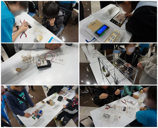 当日は、千葉県内の小学生やその兄弟等合わせて48名がワークショップに参加。まず講座では、配られた材料を切断したり曲げ伸ばししたりして形を整え、ブレッドボードに配線。完成した自分の金属探知機を様々な金属に近づけ、音の変化を体験した。