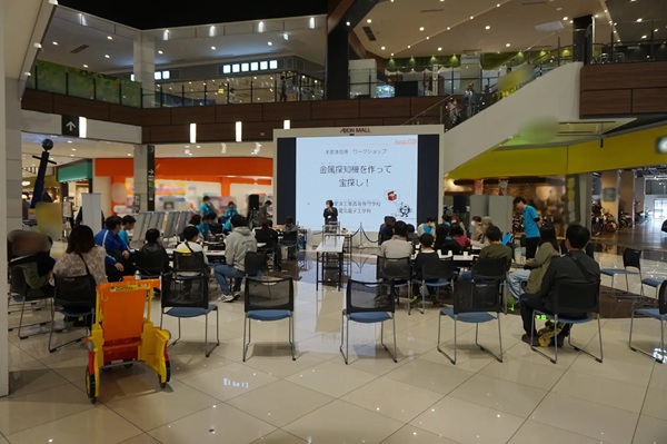 今回のワークショップも大型サイネージのある吹き抜けの会場での実施となった。会場外から大型サイネージをみて講義を聴講する人がいたり、たまたま通りかかって参加する人がいたり、買い物ついでに地域の人々にワークショップを楽しんでもらえる良い機会になったとのことだ。