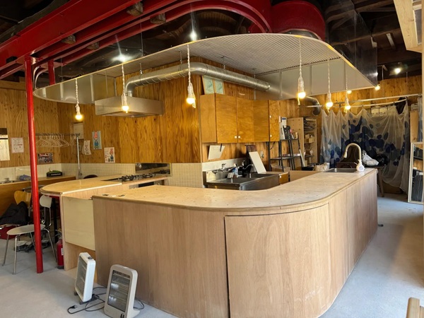 建物は地域に親しまれてきた旧精肉店としての記憶を継承し、空間の中心にキッチンを配置するとともに、道路側には全面開放可能な建具を採用し、建物内の活動や賑わいが自然とまちに滲み出る構成としている。