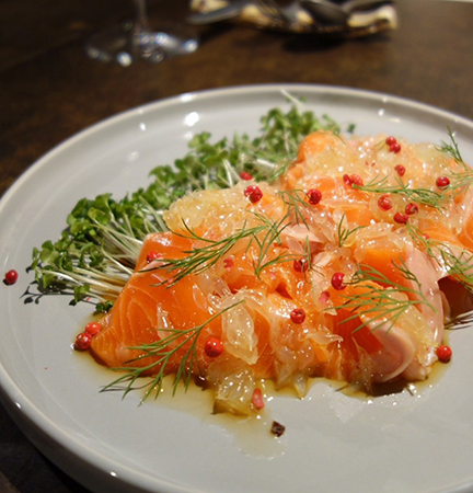 サクラマスのポワソン クリュ ラヴィゴットソースは、上品な脂と引き締まった身、さっぱりとした酸味のソースが食欲をかきたてる。