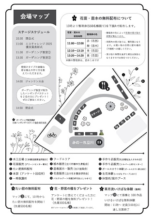 同イベントでは、花苗・苗木が550人に無料で配布される。混雑緩和のため、当日10:00より配布される整理券の色によって苗の受け取り時間を指定。整理券赤色・緑色は11:00~12:00、整理券青色は12:10~13:10、整理券黄色は13:20~14:20の配布となる。