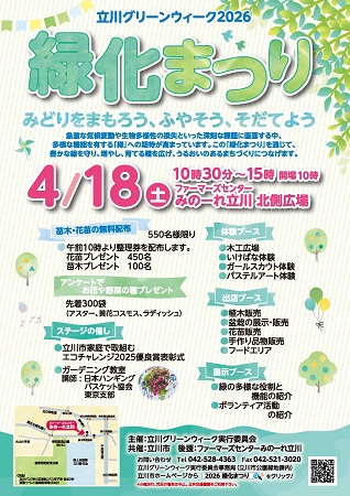 急激な気候変動や生物多様性の損失といった深刻な課題に直面する中、多様な機能を有する「緑」への期待が高まっている。立川市では、「立川グリーンウィーク2026緑化まつり」を通じて、豊かな緑を守り、増やし、育てる輪を広げ、うるおいのあるまちづくりにつなげたいと考えている。