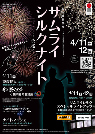 「サムライシルクナイト〜夜桜〜」では、風情のある蚕室と大木の桜並木が彩る神秘的な空間を、ユネスコ食文化創造都市に認定された鶴岡の豊かな食、夜空に咲く花火など様々なコンテンツと共に楽しむことができる。