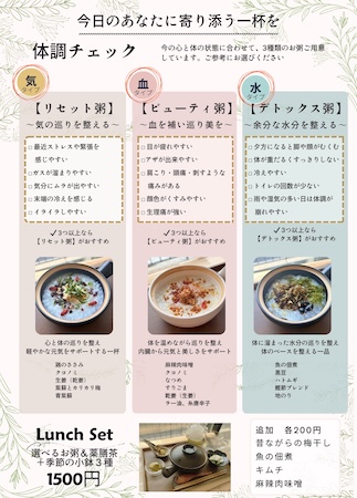 店内では、簡単な体調チェックを通して、今の自分に合った薬膳茶や薬膳粥を選ぶことが可能。冷えや疲れ、なんとなくの不調といった日々のコンディションの変化に目を向けるきっかけを作ることができるだろう。