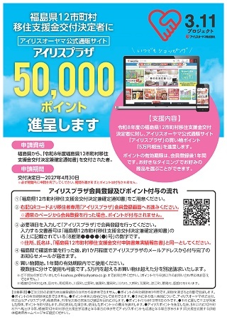 福島県とアイリスオーヤマは、2022年に12市町村の移住促進に係る協定を締結した。交付決定者には移住支援金に加え、アイリスオーヤマ公式通販サイトで利用できるポイントが50,000ポイント進呈される。
