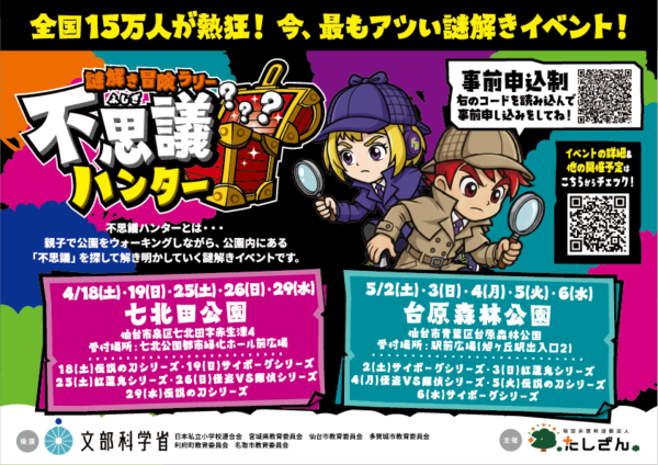 親子で楽しむ謎解きイベント「不思議ハンター」が、仙台市の公園で4月~5月に開催される。親子で学び体験できる冒険型謎解きイベントで、「伝説の刀」「怪盗VS探偵」など新シリーズも続々登場する。
