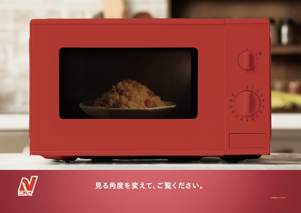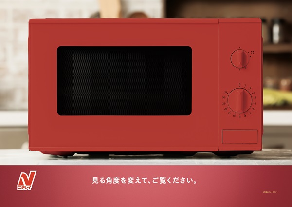 ドア横ポスターは3種。ドア横には、左右・上下と見る角度を変えることで画が切替わるインクジェットプリント技術「ベローズプリント」を活用した広告を採用しており、見る角度によって電子レンジが回ったり止まったりする様子を楽しめる。