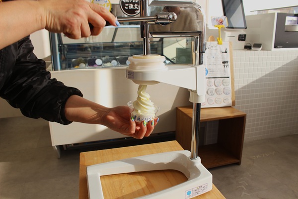 専用のジェラートマシン「まきまきマシン」では、自分でくるくるとカップに盛り付ける体験ができる。