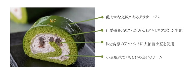「Ise-cha&Azuki Roll」は、大納言小豆と小豆のクリームを求肥で包み、伊勢茶を練りこんだふんわりとしたスポンジ生地で巻き上げたロールケーキ。