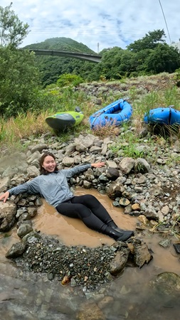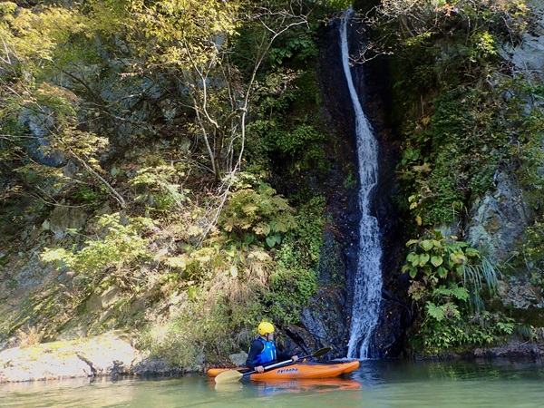 「水面屋」の屋号の由来でもある「水面」は、お店の軸となる川遊びからきているそう。温泉が湧く川での「野湯体験」や渓谷に包まれた緑の美しい水上の景色を案内する。