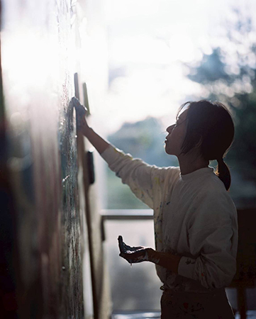 絵美さんは愛媛県出身の自然画家。油彩を起点にアクリルやクレヨンなど多様な画材で制作し、2021年より愛媛県内で個展を開催している。自然の中に流れるエネルギーや目には見えない存在をテーマに、人と自然の調和を描く。