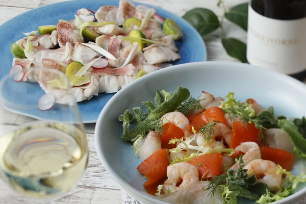 前菜には、酸味とハラペーニョの辛みを効かせたスモークサーモンと魚介のマリネや、ヨーグルトとディルのソースで味わうニシンのフリット、ほうれん草とチーズを使ったギリシャ伝統のパイ“スパナコピタ”風のキッシュをラインアップ。