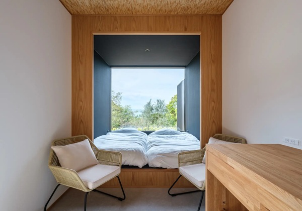 自社企画の木造トレーラーハウスを2棟設置。天井に木の梁をあらわしにした温もりのある空間で、トレーラーハウスとは思えない居心地を実現。母屋との統一感を保ちながら、海辺のトーンと古材の重厚感という2パターンの内装をデザインしている。