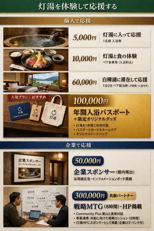 現在実施中のクラウドファンディングでは、旧「白樺湖温泉すずらんの湯」の常連、地域の別荘等保有者、近隣のスキー場利用者、地域事業者からの支援も受け、開始から1週間でファーストゴールの150万円を達成。現在は、原油・物価高の昨今においても地域や常連の人に「使いやすい」温泉・地域拠点を維持するため、ネクストゴールの300万円を目指している。