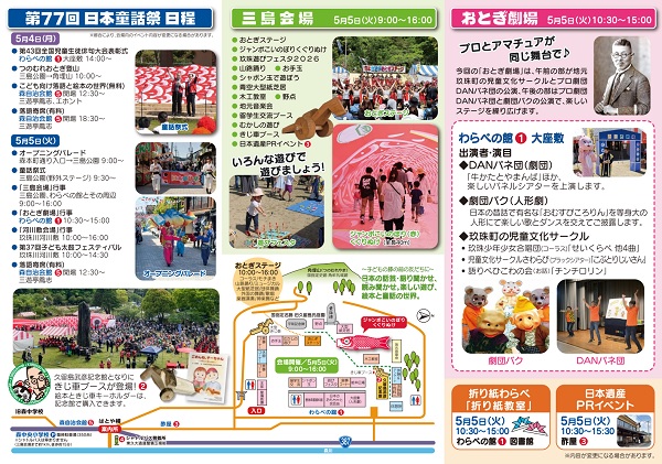 また、5月4日(月・祝)には、わらべの館で「第43回全国児童生徒俳句大会表彰式」、三島公園~角埋山で「つのむれおとぎ登山」を実施。森自治会館では、三遊亭鳳志氏とエホントによる「こども向け落語と絵本の世界(無料)」、三遊亭鳳志氏による「落語寄席(有料:1,000円)」も開催される。