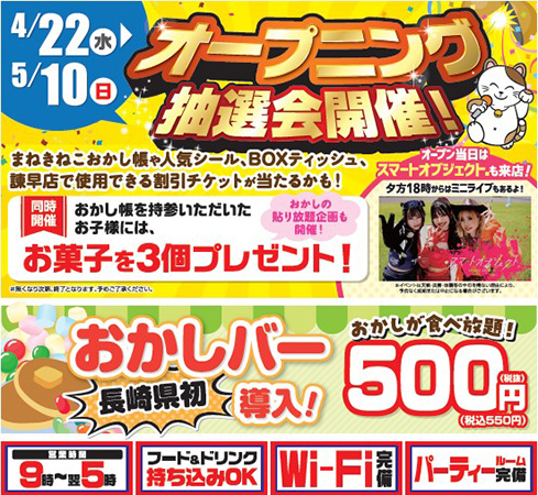 大抽選会では、まねきねこオリジナルグッズ、BOXティッシュ、「カラオケまねきねこ 諫早店」で使用できる割引チケットなどが当たる。子ども向け企画は、おかし帳を持参した子どもを対象にお菓子3個をプレゼントするほか「おかしの貼り放題」企画も開催。また、5月末日まで利用可能な「室料20%OFFクーポン」を配布する。さらに、特別ゲストに「スマートオブジェクト」を招き、18:00からミニライブで店内を盛り上げる。