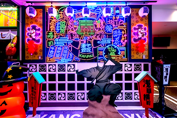 「浅草横町」は、昭和レトロな雰囲気とネオンが楽しめる中、鰻・もんじゃ・焼鳥・寿司・焼とん・総合居酒屋など、7店舗の飲食店とレンタル着物店が揃っている。