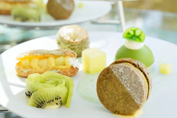 南国の軽やかな甘みのマンゴーソースがアクセントのメロンムースやメロンマカロン、しっとり食感の抹茶フィナンシェなど今だけの味わいのハーモニーを楽しめる。
