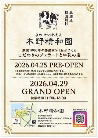 HARU.は北海道苫前郡初山別村にて、ジェラート・牛乳の店「木野精和園(きのせいわえん)」を4月29日(水)にオープンする。