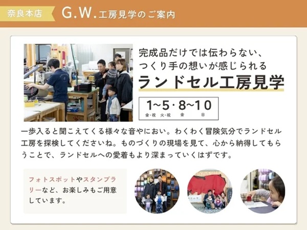 「ランドセル工房見学」開催期間:5月1日(金)~5日(火)・8日(金)〜10日(日)